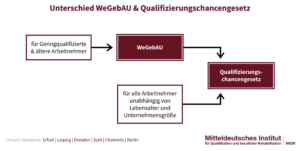 Im Zuge der Weiterbildungsoffensive wurde am 01. Januar 2019 das Qualifizierungschancengesetz verabschiedet. Damit wird die „Weiterbildung Geringqualifizierter und beschäftigter älterer Arbeitnehmer in Unternehmen“ (WeGebAU) abgelöst bzw. erweitert. Mit dem Qualifizierungschancengesetz sollen mehr Möglichkeiten für Arbeitgeber*innen geschaffen werden, die Weiterbildung von Arbeitnehmer*innen fördern zu lassen. Die Zielgruppe wurde erweitert. Insgesamt wurden drei verschiedene Themenfelder mit dem Einsetzen des Qualifizierungschancengesetzes verändert.